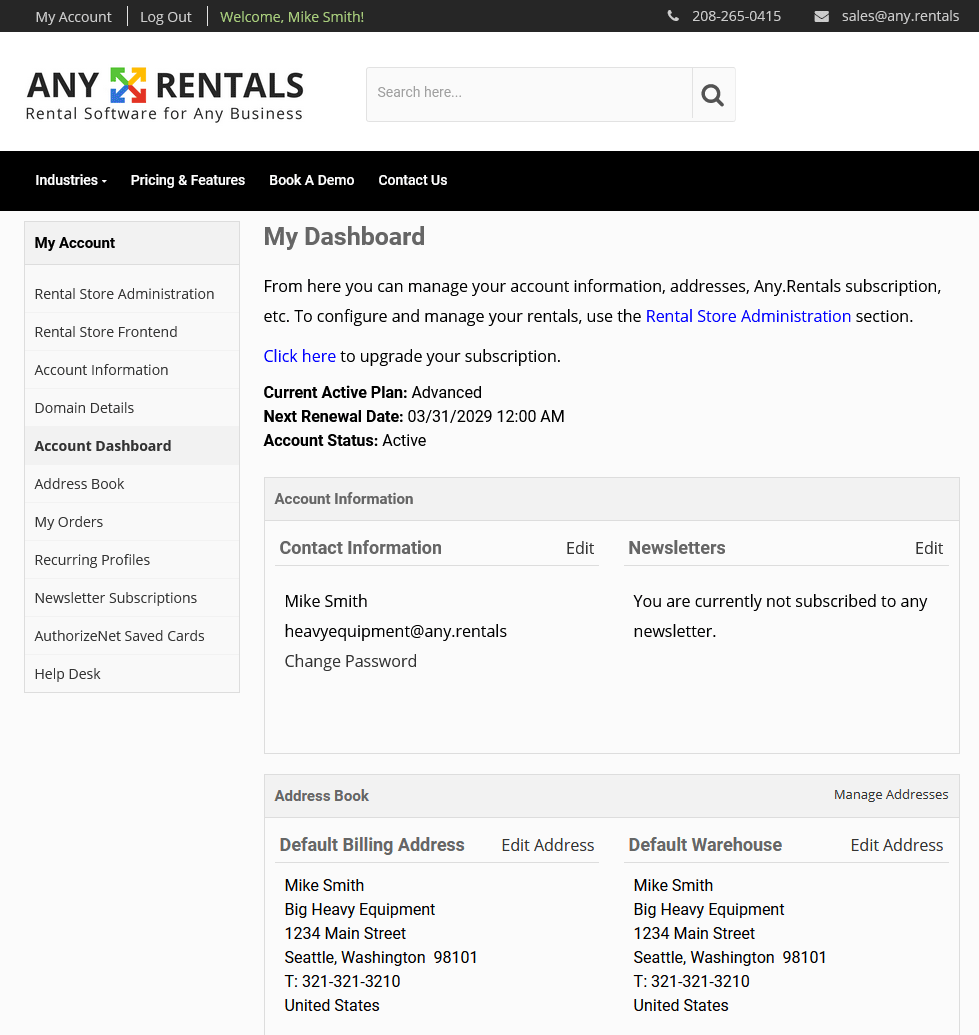 Use your Account Manager to make any changes related to your Any.Rentals account, such as your subscription level, billing information, etc.