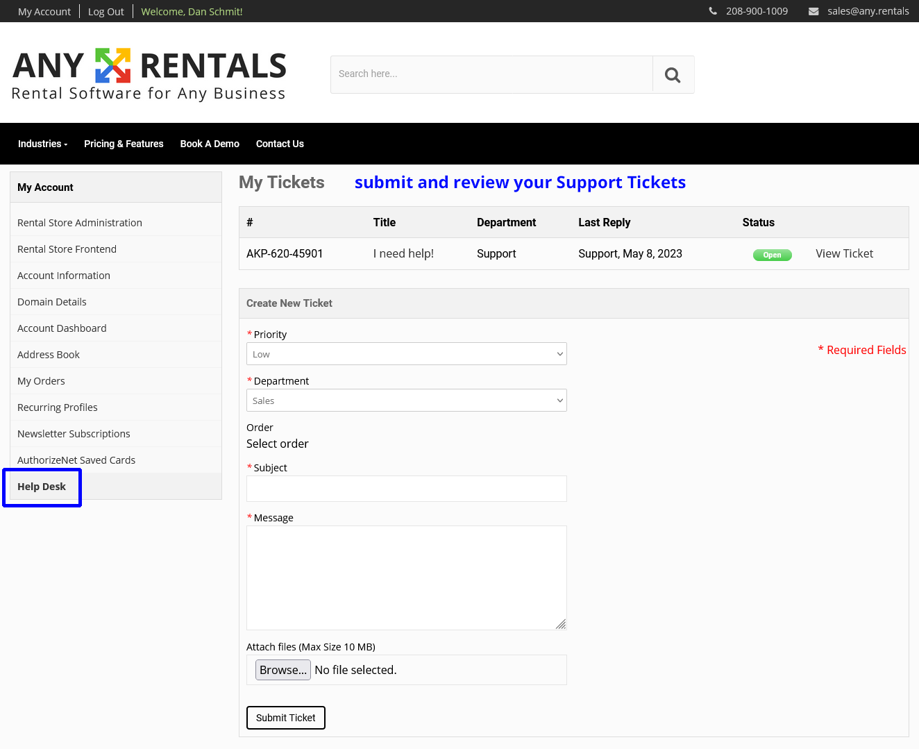 After logging-in, from the left menu, select Help Desk. Here you can view any prior support tickets, or submit a new ticket as needed.